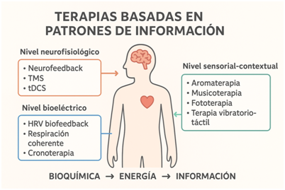 Sería un enfoque terapéutico basado en la idea de que la información —no solo la energía ni la materia— puede ser utilizada para reequilibrar la salud. Aquí, información no se refiere solo a datos digitales, sino a patrones organizativos, coherencia, significado, estructura, frecuencias, campos, etc.